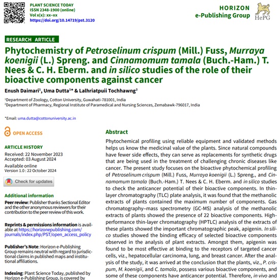 Phytochemistry of Petroselinum crispum (Mill.) Fuss, Murraya koenigii (L.) Spreng. and Cinnamomum tamala (Buch.-Ham.) T. Nees & C. H. Eberm. and in silico studies of the role of their bioactive components against cancer