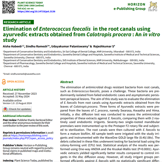 Elimination of Enterococcus faecalis in the root canals using Ayurvedic extracts obtained from Calotropis procera: An in-vitro study