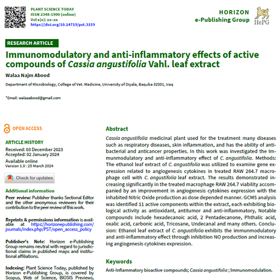 Cassia angustifolia Vahl. is a medicinal plant known for its efficacy in treating various, including respiratory conditions and skin inflammation. It possesses antibacterial and anticancer properties. This work investigated the immunomodulatory and anti-inflammatory effects of C. angustifolia. The ethanol leaf extract of C. angustifolia was utilized to examine gene expression related to angiogenesis cytokines in RAW 264.7 macrophage cells. The results demonstrated a significant increase in the viability of treated macrophage RAW 264.7 cells, accompanied by an improvement in angiogenesis cytokines expression and a dose-dependent inhibition of nitric oxide production. GC-MS analysis identified 11 active components within the extract, each exhibiting distinct biological activities such as antioxidant, antitumor and anti-inflammatory effects. Notable compounds include hexadecanoic acid, 2-pentadecanone, phthalic acid, oxalic acid, carbonic acid, tricosane, undecanal and many others. In conclusion, ethanol leaf extract of C. angustifolia exhibits immunomodulatory and anti-inflammatory effects by inhibiting nitric oxide production and enhancing the expression of angiogenesis cytokines.