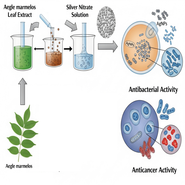 This study presents a green synthesis approach for silver nanoparticles (AgNPs) using an aqueous leaf extract of Aegle marmelos. This approach provides AgNPs with median size of 21 nm and plasmon resonance structures with a peak at 474 nm. The synthesized AgNPs were characterized using SEM EDX, FTIR, XRD and UV-Vis Spectrometer. The biosynthesis of AgNPs demonstrated notable antibacterial activity, with the highest zone of inhibition observed for E. coli (16.23 ± 0.87 mm) at a concentration of 150 µg/mL. The AgNPs were further evaluated for their anticancer activity against HCT 116 cell lines and it was declared that the AgNPs were active against the cell lines with an IC50 value of 39.33 ± 0.19 µg/mL. These findings suggest that AgNPs synthesised using A. marmelos extract possess promising antimicrobial and anticancer properties.