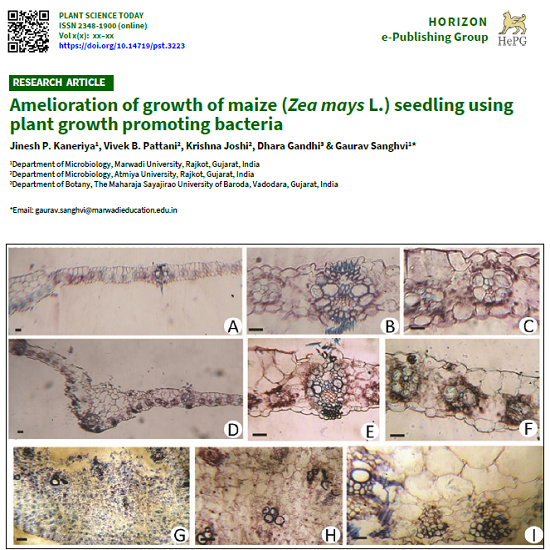 This research was aimed to screen plant growth promoting bacteria (PGPB) from soil and study its effect on maize plant growth. PGPB were isolated from Saurashtra coastal region soil and cultured in Nitrogen fixing Ashby’s medium to find potent of PGPBs, we conducted a thorough screening process, assessed their abilities in phosphate and zinc solubilization, siderophore production, hydrogen cyanide (HCN) release and the antifungal activity was performed against Fusarium oxysporum, a pathogenic fungus. These tests helped us identify bacteria with plant growth-promoting characteristics for plants. Bacterial isolates which provided better results were sequenced and sequences were submitted to NCBI. Bacterial isolates selected for application on maize in primary screening showed most treated seeds increased the seedling vigor of maize. In the latter stages of screening where bacterial consortia were developed from primary and secondary screening. In 30 days, the experiment in maize plant height, number of leaves, chlorophyll content and anatomy was analysed. All the bacterium consortiums displayed an increase in height (24.75%), number of leaves (47.77%) and total chlorophyll content (23.59%) as compared to the control maize plant. Additionally, microscopic examination of the treated plants showed improved growth, especially in the increased starch grain content in the leaves, stems and roots. Out of the eleven PGPB consortia, 3 specific PGPB consortia in this study have significantly substantiated the growth of maize plants as evidenced by the comprehensive analysis of anatomical features.