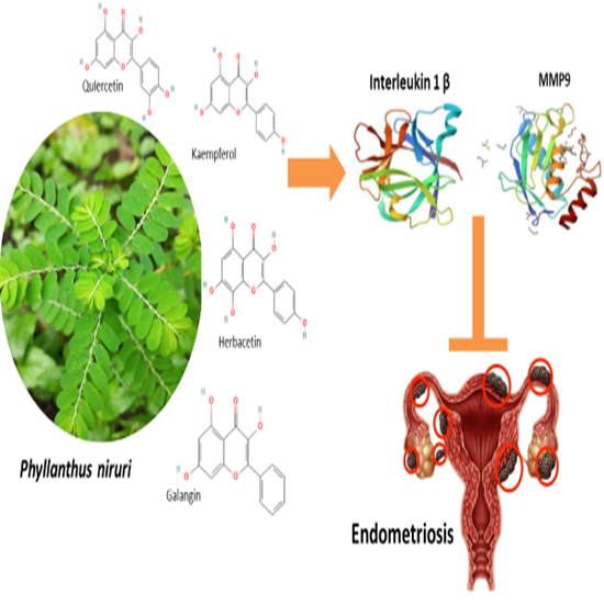 Molecular docking results showed quercetin's potential as an MMP-9 inhibitor and galangin's potential as an IL-1 beta inhibitor. These findings support the therapeutic potential of P. niruri for endometriosis, providing insights for further research in developing innovative therapies targeting endometriosis-related inflammation and angiogenesis.