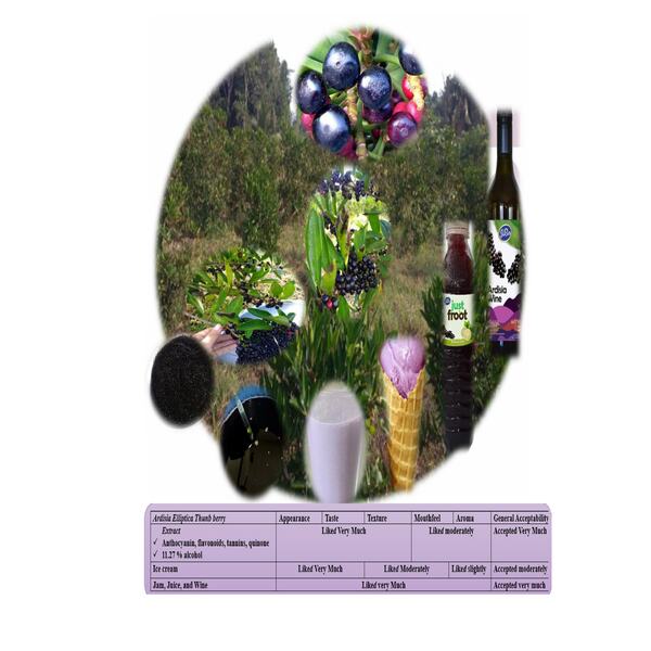 Ardisia elliptica Thunb. (AE) is an underutilized shrubs that serve as a potent and cost-effective source of raw materials for nutraceuticals and pharmaceuticals. Research revealed that these berries contain phytochemical compounds such as anthocyanins, flavonoids, tannins and quinones with a high 88 %-89 % antioxidant potential, which benefits human health. This study evaluated the sensory attributes and acceptability of AE extract, ice cream, jam, juice and wine. The assessment utilized the Hedonic scale, frequency count and mean analysis. The sensory and acceptability attributes of the A. elliptica extract were liked very much in terms of its appearance, taste and texture. In contrast, its aroma and mouthfeel were liked moderately and generally accepted very much. For AE ice cream, the appearance was liked very much in different variations, the taste, texture and mouthfeel were liked moderately and the aroma was liked slightly and accepted moderately. AE jam and juice were both liked and accepted very much despite their astringency. Moreover, the AE wine was liked and accepted moderately, too. These significant findings serve as vital bases for identifying nutritious and cheap raw material sources, enhancing the value of the diverse A. elliptica Thunb. plant.