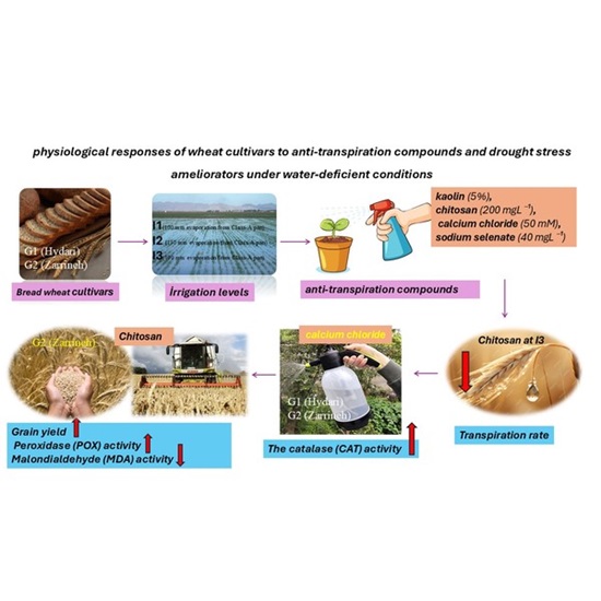 Anti-transpiration compounds are essential for mitigating the impact of water scarcity by reducing plant water uptake and enhancing water use efficiency. To evaluate the effects of these compounds on the physiological traits of wheat cultivars under water deficit conditions, 2 field trials were conducted during the 2019 and 2020 cultivation periods. The trails involved three irrigation levels: I1 (100 mm evaporation from Class-A pan), I2 (130 mm evaporation from Class-A pan) and I3 (160 mm evaporation from Class-A pan), which were applied to the main plots. Two bread wheat genotypes, G1 (Hydari) and G2 (Zarrineh), were used in the trails. Various anti-transpiration and stress amelioration compounds were tested, including kaolin (5 %), chitosan (200 mgL?¹), calcium chloride (50 mM), sodium selenate (40 mgL?¹) and a control treatment, which were randomized in subplots. In both years, the most significant reduction in transpiration was observed with the foliar application of chitosan following irrigation after 160 mm evaporation. Catalase (CAT) activity increased in both cultivars when subjected to foliar application of calcium chloride. Additionally, the chitosan treatment exhibited the highest peroxidase activity and the lowest malondialdehyde (MDA) activity. Notably, the chitosan treatment, particularly under irrigation withholding at the I1 level, resulted in the highest grain yield, especially with the Zarrineh cultivar. The application of anti-transpiration compounds demonstrated the ability to elevate levels of antioxidant enzymes and enhance the physiological traits of wheat under stress conditions. However, it is important to note that the extent of these improvements varies based on the timing of stress application and the type of cultivar involved.