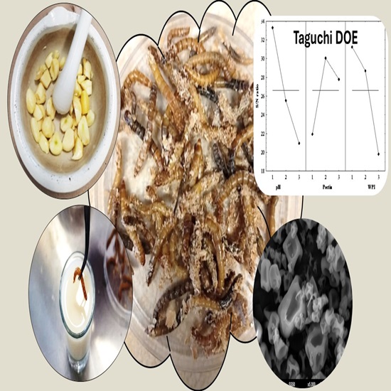 Garlic (Allium sativum L.) has been widely studied for its insecticidal properties. The primary bioactive molecule in garlic extracts include allicin, alliin, S-allylcysteine, diallyl disulfide, diallyl trisulfide, diallyl sulfide and ajoene. However, these compounds degrade under environmental conditions once extracted. This study aimed to enhance the effectiveness of garlic extracts in controlling Tenebrio molitor by optimizing microencapsulation techniques. The garlic extracts were encapsulated using the complex coacervation method, with independent variables including pH levels (3, 6 and 9), whey protein isolate (WPI) (4 %, 6 % and 8 % w/v) and pectin (0.50 %, 0.75 % and 1.00 % w/v). A Taguchi L9 (33) orthogonal array was employed to design 9 treatments, and T. molitor mortality was assessed 72 h after a 10 sec immersion of the insects in the treatments. Statistical analysis revealed that WPI had the most significant influence (24.52 %), followed by pH (18.82 %) and pectin (7.79 %). The interaction between pH and pectin had the greatest effect on the encapsulation process, accounting for 38.65 % of the influence. The optimal microencapsulation conditions were predicted by software to be pH 3, a pectin concentration of 0.75 % w/v and a WPI concentration of 4.00 % w/v, resulting in a signal-to-noise (S/N) ratio of 42.30. Experimental validation of these conditions produced an S/N ratio of 18.54, corresponding to a T. molitor mortality rate of 92 % ± 4.47 %. The resulting microcapsules had diameters ranging from 1–5 ?m. Complex coacervation is a highly promising method for microencapsulating garlic extracts and preserving their insecticidal properties.