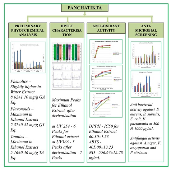 Panchatikta is an Ayurvedic drug combination of 5 bitter-tasting drugs, namely Azadirachta indica, Tinospora cordifolia, Justicia adhatoda, Solanum virginianum and Trichosanthes dioica. In this study, estimations of the phenolic, flavonoids and tannin contents, HPTLC profile and in vitro anti-oxidant and anti-microbial potential of 3 extracts of the Panchatikta were carried out. The total phenolic content of the Panchatikta combination was almost the same in ethanol, water and hydroalcoholic extracts. Flavonoid content and tannin content were highest in ethanol extract. HPTLC profiling of the 3 extracts of Panchatikta showed the maximum number of peaks for the ethanolic extract. Water extract showed a comparatively smaller number of peaks. The maximum number of peaks was seen after derivatisation. In the DPPH assay, gallic acid has IC50 value of 5.50 ± 0.38 µg/mL; ethanol and hydroalcoholic extracts have IC50 close to 60 µg/mL and water extract has around 90 µg/mL. The ABTS assay showed standard ascorbic acid has a IC50 value of 67.33 ± 0.58 µg/mL while Panchatikta extracts have a much higher IC50. In nitric oxide assay also, tested samples have a higher IC50 when compared with that of ascorbic acid (177.33 ± 5.09). In well diffusion assay for antibacterial screening, all 3 extracts have a significant zone of inhibition at concentrations of 500 µg and 1000 µg. Pseudomonas aeruginosa was found to be resistant to all 3 test samples and standard antibiotic discs. Minimum activity was obtained against Klebsiella pneumonia. Panchatikta extracts at concentrations of 500 µg and 1000 µg showed significant activity against the fungal strains Aspergillus niger and Fusarium oxysporum. In conclusion, the results of the study can provide scientific support for the traditional usage of the Ayurvedic drug combination Panchatikta for various ailments.
