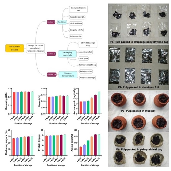Tamarind (Tamarindus indica L.) is a versatile spice crop with economic significance, known for its diverse applications in pulp, seed and timber. Thriving in challenging conditions like poor soils and drought, it has become crucial in various uses, particularly in wastelands. In this post-harvest study, tamarind pods underwent deshelling, deseeding and defibering before applying treatments to extend the shelf life of the pulp. Five additives and four packaging materials, under 2 storage conditions, were tested in a factorial design. Results of over 6 months revealed that treating tamarind pulp with 0.2 % sulphur fumes, packed in aluminium foil, and stored refrigerated minimized browning and moisture content. This treatment also showed lower total carbohydrate, reducing sugar, protein, amino acid and total phenol content. Conversely, pulp treated with 2.0 % ascorbic acid, packed in palmyrah leaf bags and stored refrigerated exhibited higher acidity. Pulp treated with 0.2 % sulphur fumes, packed in palmyrah leaf bags and stored under ambience showed consistently higher total soluble solids. The findings suggest that treating pulp with 0.2 % sulphur fumes, using aluminium foil for packing and refrigerated storage can significantly reduce browning, making it an ideal choice for extended stability and potential export markets. Furthermore, adopting aluminium foil as a packing material in Indian conditions proves economically feasible, ensuring better pulp quality during prolonged storage, particularly for small-scale tamarind growers.