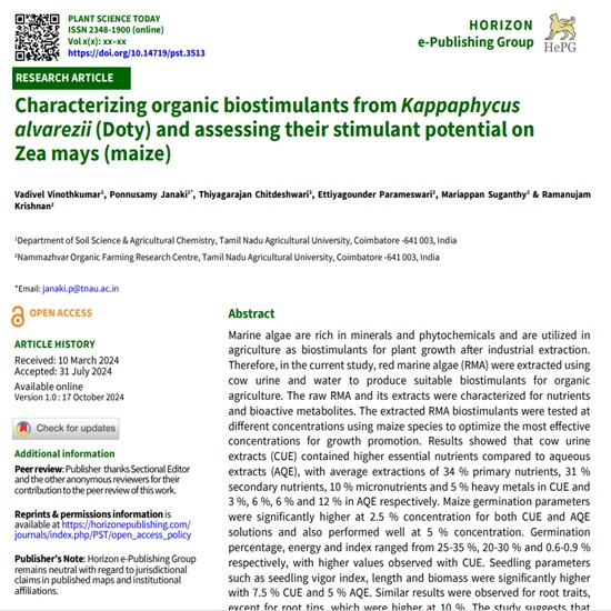 Characterizing organic biostimulants from Kappaphycus alvarezii (Doty) and assessing their stimulant potential on Zea mays (maize)