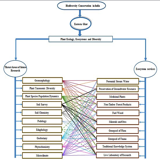 The Eastern Ghats, a discontinuous range of mountains spanning Odisha, Andhra Pradesh, Telangana, Tamil Nadu, and Karnataka has a humid tropical monsoon climate with moderate to high temperatures and heavy rainfall. The Eastern Ghats offer a diverse range of flora and fauna, including endemics. The vegetation is classified into various forest types, including moist deciduous, dry deciduous, dry evergreen, evergreen, semi-evergreen, scrub jungles, and savannah. Eastern Ghat reflects the healthy carrying capacity of the ecosystem. The Eastern Ghats boasts a diverse plant community, with over 3200 flowering plant species, largely due to geographic factors, high seasonality, and elevational variations. The Eastern Ghats, a significant biodiversity granary in India, has been the subject of numerous taxonomic and quantitative surveys. The eastern coast of India's eastern forest (Eastern Ghats) is facing a decline in plant diversity due to overexploitation, habitat destruction, and rampant grazing. This has led to species loss and extinction. The forest cover has also decreased due to anthropogenic pressures. However, there is a lack of significant research on plant species population dynamics, soil surveys, soil chemistry, geomorphology, geobotany, pedology, edaphology, and phytochemistry. To address this, modern science and technology approaches, such as geomorphometry and geobotanical studies using Remote Sensing and GIS techniques, are the need of the hour.