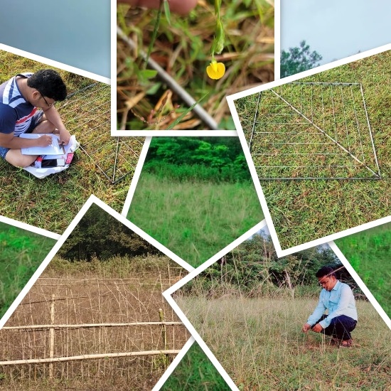 A phytosociological study of the grassland community at Maharaja Purna Chandra Autonomous College (21 º 93’ N; 86 º 76' E) was conducted from July 2022 to July 2023. The study aimed to understand the floristic diversity and propose conservation strategies. A rigorous data collection methodology was implemented using 1 m × 1 m quadrat sampling, and the findings were analyzed and presented using a novel approach. Parameters such as occurrence (+) and non-occurrence (-) of species, frequency, density, abundance, basal area, basal cover, and Important Value Index (IVI) were recorded for 36 species (18 grasses and 18 non-grasses) throughout the research period. The study revealed that certain species, including Chrysopogon acciculatus and Evolvulus nummularius, exhibited high frequency, density, abundance and IVI throughout the research period. Conversely, Eragrostis unioloides and Sida cordifolia showed the lowest IVI during the study. Basal area and basal cover data indicated an inverse relationship between grasses and non-grasses. The total Relative Frequency (RF), Relative Density (RD), and Relative Dominance (RDo.) of the community were consistently around 100 for each month, and the total IVI values were approximately 300 each month. These results underscore the need for effective conservation strategies to preserve the unique floristic diversity of this grassland community. The remarkable phytosociological attributes of this experimental grassland community may be attributed to the topography, soil composition, and climatic conditions of the locality.