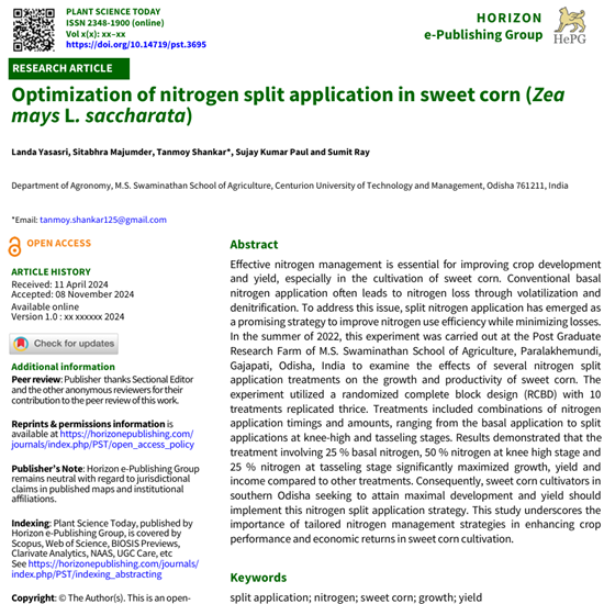 3. Sairam M, Maitra S, Sahoo U, Sagar L, Krishna TG. Evaluation of precision nutrient tools and nutrient optimization in maize (Zea mays L.) for enhancement of growth, productivity and nutrient use efficiency. Res Crop. 2023;24:666-667.https://doi.org/10.31830/2348-7542.2023.ROC-1016 .