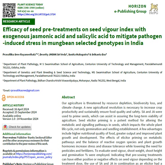 Our agriculture is threatened by resource depletion, biodiversity loss, and climate change. A new agricultural revolution is necessary to increase crop productivity and sustainably ensure food quality and safety. SA and JA were used to prime seeds, which can assist in assuring the long-term viability of agriculture. Seed elicitor priming is a potent method for altering the metabolic and signalling pathways in seeds, which impacts the whole plant life cycle, not only germination and seedling establishment. A few advantages include higher nutritional quality of food, greater output, and improved plant growth and development. The effects of elicitor priming on metabolic pathways and the balance of reactive oxygen species and plant growth hormones increase stress and disease tolerance while lowering the need for pesticides and fertilizers. To evaluate seed vigour, shoot weight, shoot height and germination % were employed. Indicating that pre-sowing treatments can have either positive or negative effects on seed vigour depending on the treatment dose, the use of SA and JA in combination as an elicitor had a marginally advantageous impact on seed vigour. More studies are required to determine their effects and the ideal seed priming dosage.