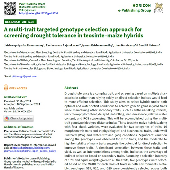 Drought tolerance is a complex characteristic and screening based on multiple traits rather than direct selection indices would result in more efficient selection. The study aims to select hybrids under optimal and water deficit conditions to achieve genetic gains in yield traits without compromising the other secondary traits viz., anthesis-silking interval, leaf chlorophyll content, delayed leaf rolling and leaf senescence, relative water content, and ROS scavenging using the multi-trait genotype ideotype distance index. The 30 teosinte-maize hybrids along with four checks were evaluated for two classes of traits: 16 morphometric and 14 physiological and biochemical traits, under well-watered (WW) and water-stress (WS) environments. Significant variations among the genotypes were observed for most traits and the presence of moderate to high heritability for most traits suggests direct selection for improvement of those traits. Significant correlation of the traits with yield and intercorrelations between traits indicate the advantage of indirect selection based on secondary traits. By assuming a selection intensity of 15% and equal weightage to all the traits, five genotypes were selected based on the MGIDI under each class of traits and in each environment. The genotypes viz. G19, G20, and G29 were commonly selected across both environments. The selection led to desired positive and negative selection gains for most of the traits studied and resulted in high positive gains for single plant yield of 35.6% under WW and 69.3% under WS. The strength and weakness plots effectively present the advantages and limitations of the selected genotypes under each environment. The multi-trait-based selection approach is an effective tool for selecting genotypes and designing breeding strategies for stress breeding.