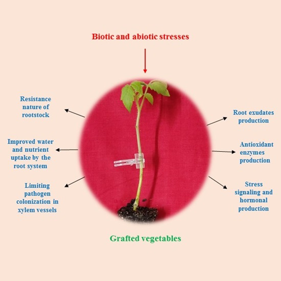 Vegetables are considered protective foods with high nutritional value and play an important role in subsistence farming, generating more income. Vegetable crops are highly sensitive to weather fluctuations, which impact their growth, flowering and fruit development and ultimately reduce yield. Grafting has become a viable green surgical option to decelerate conventional breeding approaches to enhance resilience to biotic and abiotic stresses. It is the technique of uniting 2 plants with different genetic backgrounds to create a new one, allowing genetic differences to transfer to the scion. This process offers a better alternative to chemical sterilants in mitigating certain soil-borne diseases in vegetable crops. Solanaceous and Cucurbitaceous vegetable grafting is commercially practiced and has a greater impact in farmers’ fields. Grafting is suggested to mitigate environmental changes' negative impact on vegetable quantity and quality by enhancing physiological activities in plants grafted onto rootstocks with potential traits. This method offers insights into stress response mechanisms, improves stress tolerance and enhances vegetable yield and quality. Recent research on vegetable grafting aims to promote sustainable agriculture by offering resilient, high-yielding crop varieties, such as dual-grafted Brimato, suitable for urban and suburban areas. Research is necessary to comprehend the genetic mechanism and physiological process of grafting technology, with a focus on identifying key physiological processes associated with the characteristic features of rootstock.