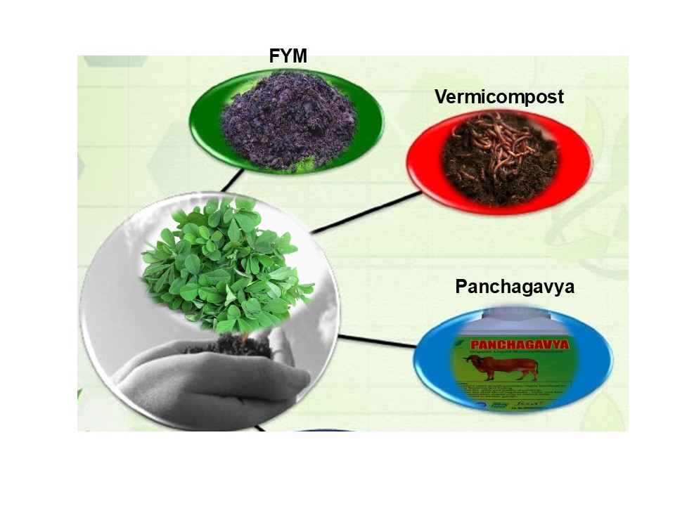 Trigonella foenum-graecum commonly called fenugreek is an important minor spice belonging to the family Fabaceae (Leguminosae). Its seeds serve as a condiment to flavor food, while its leaves are commonly used as a vegetable. Given the widespread culinary use of fenugreek leaves, enhancing herbage yield and optimizing organic inputs for leaf production is essential. A study was conducted at the Department of Spices and Plantation Crops, HC and RI, TNAU, Periyakulam, to investigate the impact of organic manures and bio-stimulants on the growth, yield of herbage and quality of fenugreek. The results demonstrated that the combination of 25% nitrogen (N) from farmyard manure (FYM), 75% N from vermicompost and Panchagavya (3%) as a foliar spray significantly improved various growth parameters. Specifically, this treatment improved plant height (30.38 cm), the number of leaves branch-1 (9.42), the number of branches plant-1 (9.34) and herbage yield metrics, including yield plant-1 (2.85 g), yield plot-1 (2*2 m) (3.39 kg) and estimated herbage yield (16.95 tons ha-1) when compared to the control. Additionally, this treatment enhanced leaf quality by recording the highest contents of carbohydrate (6.63%), fiber (3.31%), iron (35.67 mg 100 g-1), calcium (178.36 mg 100 g-1) and protein (25.17 g 100 g-1). Therefore, the application of vermicompost with FYM and Panchagavya is more effective for achieving maximum growth and yield levels compared to using these inputs individually.