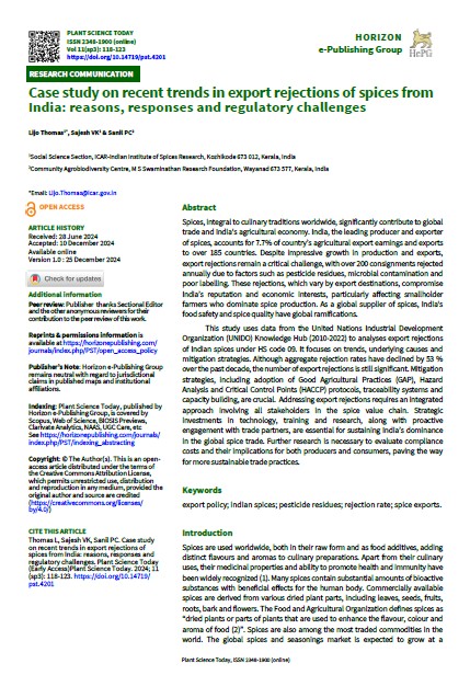 This study uses data from the United Nations Industrial Development Organization (UNIDO) Knowledge Hub (2010-2022) to analyses export rejections of Indian spices under HS code 09. It focuses on trends, underlying causes and mitigation strategies. Although aggregate rejection rates have declined by 53 % over the past decade, the number of export rejections is still significant. Mitigation strategies, including adoption of Good Agricultural Practices (GAP), Hazard Analysis and Critical Control Points (HACCP) protocols, traceability systems and capacity building, are crucial. Addressing export rejections requires an integrated approach involving all stakeholders in the spice value chain. Strategic investments in technology, training and research, along with proactive engagement with trade partners, are essential for sustaining India’s dominance in the global spice trade. Further research is necessary to evaluate compliance costs and their implications for both producers and consumers, paving the way for more sustainable trade practices.