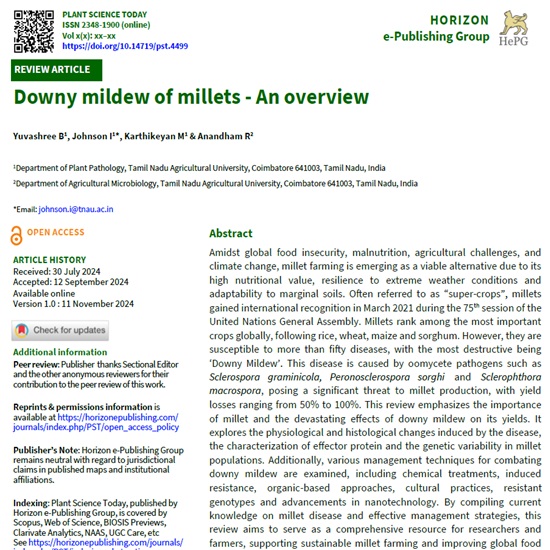 Amidst global food insecurity, malnutrition, agricultural challenges, and climate change, millet farming is emerging as a viable alternativedue to its high nutritional value, resilience to extreme weather conditions, and adaptability to marginal soils. Often referred to as “super-crops”, millets gained international recognition in March 2021 during the 75th session of the United Nations General Assembly. Millets rank among the most important crops globally, following rice, wheat, maize, and sorghum. However, they are susceptible to more than fifty diseases, with the most destructive being ‘Downy Mildew’. This disease is caused by oomycete pathogens such as Sclerospora graminicola, Peronosclerospora sorghi and Sclerophthora macrospora, posing a significant threat to millet production, with yield losses ranging from 50% to 100%. This review emphasizes the importance of millet and the devastating effects of downy mildew on its yields. It explores the physiological and histological changes induced by the disease, the characterization of effector protein, and the genetic variability in millet populations. Additionally, various management techniques for combating downy mildew are examined, including chemical treatments, induced resistance, organic-based approaches, cultural practices, resistant genotypes, and advancements in nanotechnology. By compiling current knowledge on millet disease and effective management strategies, this review aims to serve as a comprehensive resource for researchers and farmers, supporting sustainable millet farming and improving global food security.