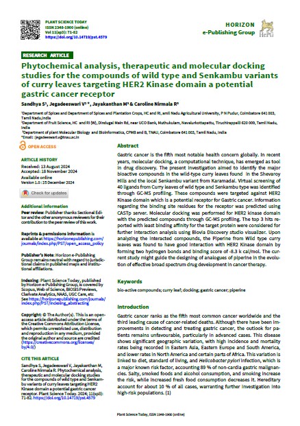 Gastric cancer is the fifth most notable health concern globally. In recent years, molecular docking, a computational technique, has emerged as tool in drug discovery. The present investigation aimed to identify the major bioactive compounds in the wild-type curry leaves found in the Shevaroy Hills and the local Senkambu variant from Karamadai. Virtual screening of 40 ligands from Curry leaves of wild type and Senkambu type was identified through GC-MS profiling. These compounds were targeted against HER2 Kinase domain which is a potential receptor for Gastric cancer. Information regarding the binding site residues for the receptor was predicted using CASTp server. Molecular docking was performed for HER2 kinase domain with the predicted compounds through GC-MS profiling. The top 3 hits reported with least binding affinity for the target protein were considered for further interaction analysis using Biovia Discovery studio visualizer. Upon analyzing the interacted compounds, the Piperine from Wild type curry leaves was found to have good interaction with HER2 Kinase domain by forming two hydrogen bonds and binding score of -8.3 kcal/mol. The current study might guide the designing of analogues of piperine in the evolution of effective broad spectrum drug development in cancer therapy.