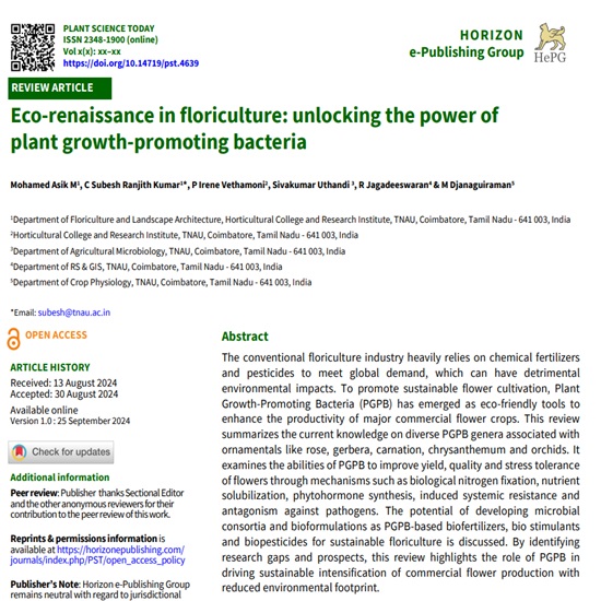 The conventional floriculture industry heavily relies on chemical fertilizers and pesticides to meet global demand, which can have detrimental environmental impacts. To promote sustainable flower cultivation, Plant Growth-Promoting Bacteria (PGPB) has emerged as eco-friendly tools to enhance the productivity of major commercial flower crops. This review summarizes the current knowledge on diverse PGPB genera associated with ornamentals like rose, gerbera, carnation, chrysanthemum and orchids. It examines the abilities of PGPB to improve yield, quality and stress tolerance of flowers through mechanisms such as biological nitrogen fixation, nutrient solubilization, phytohormone synthesis, induced systemic resistance and antagonism against pathogens. The potential of developing microbial consortia and bioformulations as PGPB-based biofertilizers, bio stimulants and biopesticides for sustainable floriculture is discussed. By identifying research gaps and prospects, this review highlights the role of PGPB in driving sustainable intensification of commercial flower production with reduced environmental footprint.