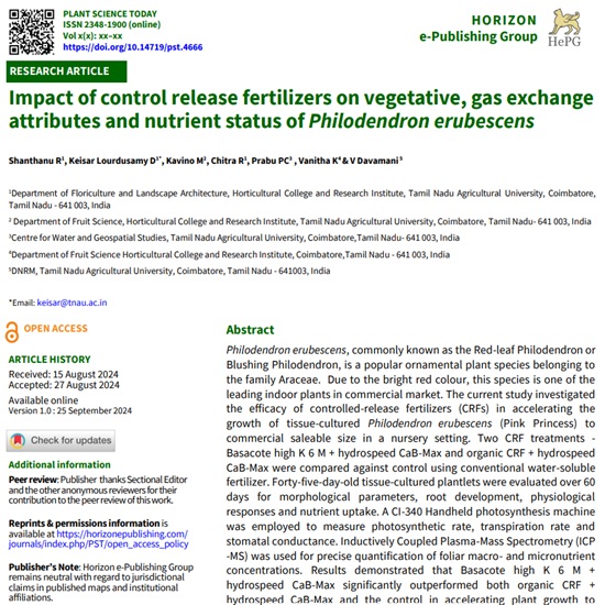 Philodendron erubescens, commonly known as the Red-leaf Philodendron or Blushing Philodendron, is a popular ornamental plant species belonging to the family Araceae. Due to the bright red colour, this species is one of the leading indoor plants in commercial market. The current study investigated the efficacy of controlled-release fertilizers (CRFs) in accelerating the growth of tissue-cultured Philodendron erubescens (Pink Princess) to commercial saleable size in a nursery setting. Two CRF treatments - Basacote high K 6 M + hydrospeed CaB-Max and organic CRF + hydrospeed CaB-Max were compared against control using conventional water-soluble fertilizer. Forty-five-day-old tissue-cultured plantlets were evaluated over 60 days for morphological parameters, root development, physiological responses and nutrient uptake. A CI-340 Handheld photosynthesis machine was employed to measure photosynthetic rate, transpiration rate and stomatal conductance. Inductively Coupled Plasma-Mass Spectrometry (ICP-MS) was used for precise quantification of foliar macro- and micronutrient concentrations. Results demonstrated that Basacote high K 6 M + hydrospeed CaB-Max significantly outperformed both organic CRF + hydrospeed CaB-Max and the control in accelerating plant growth to commercial standards. Basacote high K 6 M + hydrospeed CaB-Max treated plants reached a mean height of 28.48 cm and spread of 27.09 cm after 60 days, approaching the target saleable size of 25 to 30 cm. Root morphology analysis using WinRHIZO software revealed enhanced root system development in Basacote high K 6 M + hydrospeed CaB-Max plants, indicating improved establishment. Physiological measurements showed higher photosynthetic rates (11.46 ?mol m?² s?¹), transpiration rates (1.32 mmol m?² s?¹) and stomatal conductance (30.97 mmol m?² s?¹) in Basacote high K 6 M + hydrospeed CaB-Max plants. ICP-MS analysis indicated superior nutrient uptake and accumulation in T1-treated plants, particularly for calcium, potassium, magnesium and iron. Strong positive correlations between physiological parameters and morphological traits suggest that enhanced nutrient availability from CRFs contributed to accelerated growth and improved plant quality. This study elucidates the potential of tailored CRF formulations to optimize the rapid establishment of tissue-cultured P. erubescens into marketable plants, offering valuable insights for commercial nursery production practices.