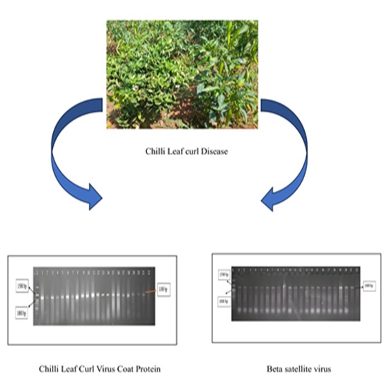 Chilli is one of the widely cultivated commercial vegetable crops in India. Chilli leaf curl is the most devasting disease and causes a yield loss of 100 per cent in Chilli. Fourteen begomovirus species cause chilli leaf curl disease (ChiLCD). An extensive survey was carried out in 2023 to determine the prevalence of the leaf curl disease of Chilli caused by begomovirus in major chilli-growing areas of the Southern Districts of Tamil Nadu. During the survey, 21 isolates of begomovirus infecting Chilli were collected. Among the 21 isolates, the isolate collected from Kalakudi village (BV-KI) exhibited severe symptoms.DNA extracted from 21 isolates of begomovirus were subjected to PCR by using Rojas universal primers, Chilli leaf curl virus (ChiLCV) Coat protein primers and beta satellite virus primers and obtained 1380 bp, 1100 bp and 1400 bp amplicons of top and coat protein region of DNA-A of begomovirus, Chilli leaf curl virus coat protein region and beta satellite virus associated with ChiLCV respectively. The 1380 bp, 1100 bp and 1400 bp amplicons obtained from the BV-KI isolate were sequenced and submitted to the NCBI. The sequences were blast analyzed, and it showed that the nucleotide sequence of the top and coat protein region of DNA-A of begomovirus and CP gene of ChiLCV BV-KI isolate was found to have 90.61 and 99.78% similarity with Bhavanisagar (NC 055130.1) isolate respectively. The nucleotide sequence of the beta satellite virus of BV-KI isolate was found to have 99.93% similarity with the Chilli leaf curl beta satellite virus Meerut (MH355642.1) isolate.