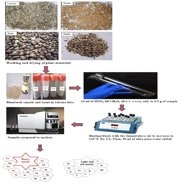 A significant portion of the global population relies on medicinal plants as their primary source of healthcare. Therefore, it is crucial to ascertain the amount of heavy metal accumulated in these plants. In this study, 25 elements (Calcium (Ca), Phosphorus (P), Magnesium (Mg), Sodium (Na), Potassium (K), Sulfur (S), Iron (Fe), Copper (Cu), Zinc (Zn), Selenium (Se), Cadmium (Cd), Vanadium (V), Chromium (Cr), Nickel (Ni), Silver (Ag), Beryllium (Be), Strontium (Sr), Barium (Ba), Aluminum (Al), Lead (Pb), Bismuth (Bi), Rubidium (Rb), Boron (B), Arsenic (As), and Antimony (Sb)) were found in the leaves and fruit of C. tournefortii Lam, and in the pods and seeds of P. farcta , collected from the Mazne sub-district of Kurdistan in Iraq. The analysis was performed using inductively coupled plasma mass spectrometry (ICP-MS) and inductively coupled plasma optical emission spectrometry (ICP-OES). An exploratory study of samples was conducted using principal component analysis (PCA) and hierarchical cluster analysis (HCA). The concentration of elements, quantified in parts per million (ppm) was as follows: Ca (3403-81948), Mg (1573-7578), Na (108-291), K (6481-23212), Fe (184-623), Cu (8-16), Zn (3-48), Se (0.5-33), Cd (0.11-0.40 ppm), V (1-3), Cr (2-25), Ni (2-4), Ag (0.5-1.7), Be (0.20-0.40), Sr (79.3-454), B (3-86), Al (100-738), Bi (0.7-2.30), Rb (1-7), B (0.7-2.3), As (0.1-3.9), Sb (6.60-12). All samples under investigation contained similar levels of K and Pb (218 and 1, respectively). The samples were divided into three major categories, as demonstrated by PCA and HCA. According to the findings, the fruit of C. tournefortii Lam is a source of Mg, K, Cu, Cd, Cr, Be, Sr, Ba, and Rb. The seeds of P. farcta had accumulated a significant level of S, Zn, Se, and Ni. Overall, the data suggest that use of these plants may pose potential health risks to humans due to the presence of certain heavy metals.