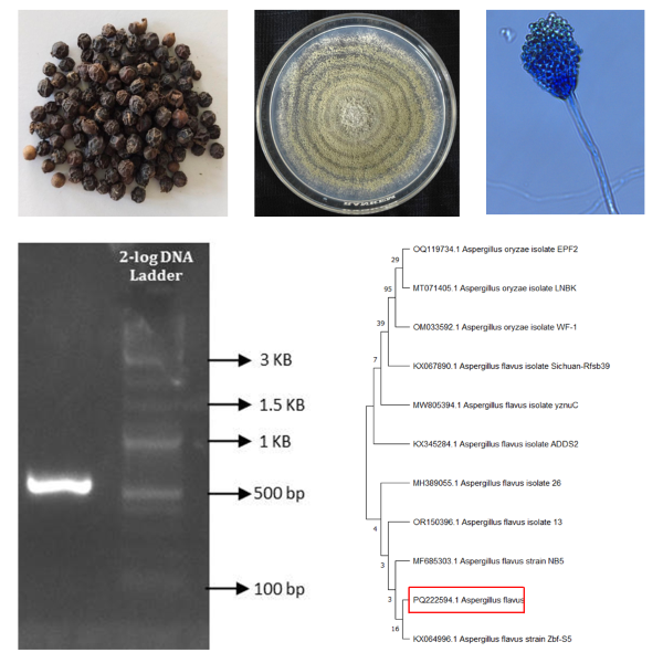 Black pepper, known as the "King of Spices" and "Black gold," is a valuable spice native to India, commonly cultivated in tropical regions. However, it is prone to fungal growth and mycotoxin contamination, particularly during storage when moisture levels rise. Therefore a survey was conducted during July - December 2023, for identifying the mycoflora associated with black pepper in storage. Stored samples of the contaminated whole black pepper collected from pepper growers in 3 locations each from Thiruvananthapuram, Kozhikode, Idukki and Wayanad districts (Agro ecological units (AEU) 14, 15, 16 and 20) of Kerala, India. Twelve samples collected were examined to record the symptoms, then isolate the mycoflora associated with the samples and the prevalent contaminants present in it were characterized. The average moisture content of the samples was determined and found below 10 per cent for all the black pepper samples. Sixty one isolates of different fungi were isolated from the samples collected from different locations in Kerala. 14 isolates from Thiruvananthapuram, 16 from Kozhikode, 16 from Wayanad and 15 from Idukki were isolated from mouldy black pepper berries. Cultural and morphological studies of the 61 isolates were carried out and the isolates includes Aspergillus sp., Penicillium sp., Syncephalastrum sp., Mucor sp., Colletotrichum sp., Helminthosporium sp. Among the contaminants, one of the isolates of Aspergillus sp. observed from most of the samples collected was subjected to cultural, morphological and molecular characterization. Major contaminant associated with black pepper at storage was identified as Aspergillus flavus.