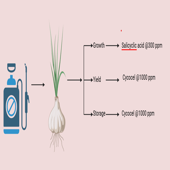 Garlic (Allium sativum L.) is a valuable bulb crop, known for its rich bioactive compounds and health benefits. This study aimed to evaluate the impact of various foliar spray treatments on the growth, yield and quality of garlic cv. Ooty 2. The treatments included a control, 100 ppm, 200 ppm and 300 ppm of salicylic acid, cycocel at 1000 ppm and ethrel 200, 300 ppm sprayed at 45 and 60 days after planting. The experiment was conducted using a randomized block design with 7 treatments and 3 replications. Results revealed that salicylic acid 300 ppm increased growth traits followed by ethrel 300 ppm over the control. Cycocel 1000 ppm showed that high bulb yield and less reduction in quality characters viz., TSS (39.2 ?Brix), acidity (0.38 %), ascorbic acid (11.25 mg 100 g-1), total carbohydrate (39.82 g 100 g-1) and phenolics (4.10 mg 100 g-1) content during 3 months storage period, followed by ethrel 300 ppm. Additionally lowest levels of physiological loss in weight (17.47 %), rubbering (5.13 %), rotting (5.88 %) and total loss (23.64 %) was observed compared to all other treatments during the storage period. The results indicate that cycocel at 1000 ppm had the most beneficial effects and can be effectively used to enhance the harvest, post-harvest traits and quality and storability of garlic bulbs.