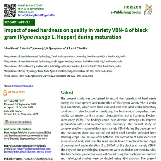 The present study was performed to record the formation of hard seeds during the development and maturation of Blackgram variety VBN-8 under field conditions, which were then assessed and evaluated under laboratory conditions. It also focused on analyzing the biochemical properties, seed quality parameters and structural characteristics using Scanning Electron Microscopy (SEM). The findings could help develop strategies to improve germination rates and overcome seed dormancy. The present study on complex seed formation in black gram variety VBN-8 during the development and maturation stage was carried out using seed samples collected from standing crops 3 to 38 Days after Anthesis. The formation of hard seeds was assessed and evaluated from the seed sample taken from the different stages of development and maturation (3 to 38 DAA) of the black gram variety VBN-8. The physical and physiological parameters were studied as per the ISTA rules. The biochemical properties were estimated using the fractionation method and histological studies were conducted using SEM analysis. The present investigation revealed that a higher percentage of complex seed formation was observed at 33 DAA when the seed attained physiological maturity. The biochemical analyses showed that hard seeds have much higher quantities of pectin (4.68%), cellulose (4.27%), hemicellulose (2.55%), lignin (2.30%) and phenolic contents (5.78%) as compared to non-hard seeds of lower quantities of pectin (2.01%), cellulose (1.27%), hemicellulose (1.87%), lignin (0.54%) and phenolic contents (3.68%). The SEM analysis revealed that hard seeds have a thick cuticle (60.96 µm), a waxy layer, a compartmentalized pattern, amorphous deposits and a rough texture, all hindering water uptake.