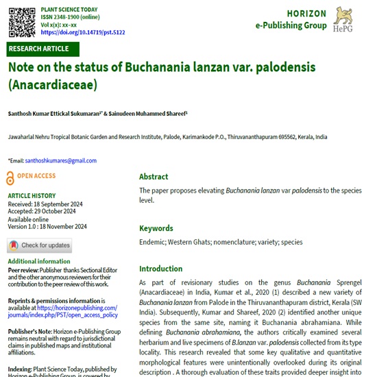Santhosh Kumar ES, Shareef SM, Raj Vikraman R. A new variety of Buchanania lanzan (Anacardiaceae) from Kerala, India. I3 Biodiversity. 2020;8:801:1-5.