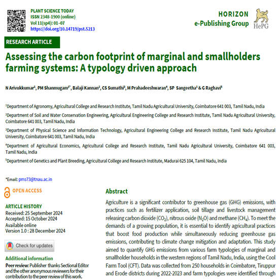 Agriculture is a significant contributor to greenhouse gas (GHG) emissions, with practices such as fertilizer application, soil tillage and livestock management releasing carbon dioxide (CO2), nitrous oxide (N2O) and methane (CH4). To meet the demands of a growing population, it is essential to identify agricultural practices that boost food production while simultaneously reducing greenhouse gas emissions, contributing to climate change mitigation and adaptation. This study aimed to quantify GHG emissions from various farm typologies of marginal and smallholder households in the western regions of Tamil Nadu, India, using the cool farm tool (CFT). Data was collected from 250 households in Coimbatore, Tiruppur and Erode districts during 2022-2023 and farm typologies were identified through multivariate analysis, revealing four farm types: (i) cereal crop-dominated marginal farms, (ii) livestock-dominated marginal farms, (iii) cash crop-dominated marginal farms and (iv) plantation crop-dominated small farms. The results show that cash crop and plantation crop dominated farms had the highest emissions, particularly from crop residue burning, fertilizer production and fertilizer application. In contrast, cereal crop-dominated farms recorded lower emissions. Livestock dominated farm type exhibited higher GHG emission from enteric fermentation and manure management due to higher number of livestock. The results of this study highlight the importance of developing farm-specific mitigation strategies to reduce emissions. The study also underscores the value of using tools such as CFT for comprehensive GHG quantification to ensure sustainable agricultural practices.