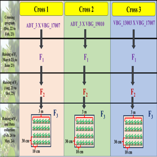 Understanding the gene action governing yield and its component traits is crucial for developing an effective breeding strategy. In the present study, generation mean analysis was employed to unravel the genetic architecture of yield and its component traits in three crosses of black gram. The crosses, namely ADT 3 × VBG 17007 (cross 1: C1), ADT 3 × VBG 19010 (cross 2: C2) and VBG 13003 × VBG 17007 (Cross 3: C3), were developed using four parents contrasting in salt tolerance. The analysis of variance revealed significant differences among the five generations-P1, P2, F1, F2 and F3-for most of the traits. All studied traits showed significance in either one or both the C and D scales, indicating the inadequacy of the additivedominance model in explaining the genetic variation. Most traits, except for clusters per plant in Cross 1 (ADT 3 × VBG 17007) and seeds per pod across all crosses, exhibited significant additive genetic components. Furthermore, non-additive components, including dominance, additive × additive and dominance × dominance interactions, were significant for all traits across the three crosses. This