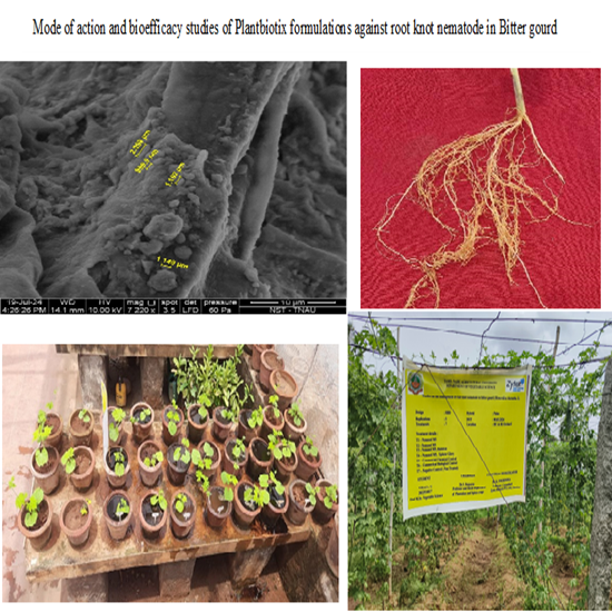 The root-knot nematode (Meloidogyne incognita) is a major pest that adversely affects bitter gourd production in India. Conventional chemical control methods, though effective, raise economic and environmental concerns, making it necessary to adopt integrated nematode management (INM) strategies. This study evaluates the bio-efficacy of PlantbiotiX formulations, including Bacillus. paralicheniformis 5 % WP ZBM5, Bacillus subtilis 2 % SP ZB87 ½, and Xplorer Glory (vesicular arbuscular mycorrhiza), for controlling root-knot nematodes in bitter gourd. Pot culture and field experiments were performed using various concentrations and application methods of PlantbiotiX formulations . Results revealed significant improvements in plant growth parameters, including vine length (9.13%), fruit weight (6.27%), number of fruits (25.21%), and yield per plant (36.36%) when B. paralicheniformis 5 % WP ZBM5 and B. subtilis 2 % SP ZB87 ½ were applied in combination. Furthermore, a substantial reduction in nematode populations was observed: soil nematode populations decreased by 72.9%, female nematodes by 65.01%, and egg mass by 60.59%. Scanning Electron Microscope (SEM) analysis of treated roots confirmed biofilm formation by B. paralichiniformis, demonstrating its capability to mitigate nematode infestation. This biofilm likely played a role in reducing nematode penetration and survival in the roots. The study indicates that PlantbiotiX formulations serve as a sustainable and environmentally friendly substitute for chemical nematicides, promoting plant growth and efficiently controlling root-knot nematodes, thereby presenting a viable solution for enhancing bitter gourd cultivation while reducing environmental harm.