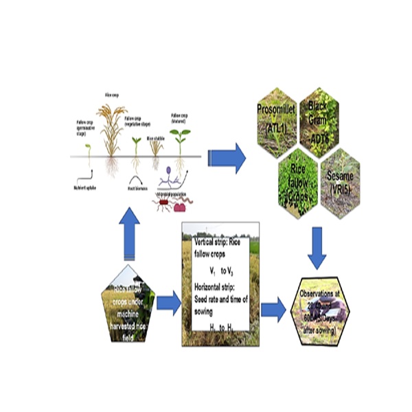 A field experiment was conducted at the Agricultural College and Research Institute, Madurai, to assess the performance of different rice fallow crops in machine-harvested rice fields. Three crops were selected for the trials: urdbean (Vigna mungo L. Hepper), sesame (Sesamum indicum) and proso millet (Panicum miliaceum). The experiment was laid out in a strip plot design with three replications, with vertical plots assigned to different crops and horizontal plots to varying seed rates and sowing times. The results of the study were particularly noteworthy for the urdbean. When urdbean was sown on the same day as the rice harvest with a 20 % increased seed rate (36 kg ha-1 ), it significantly outperformed all other treatments. This combination recorded the highest net income among the crops tested, demonstrating its superior economic viability in rice fallow systems. The study highlighted the importance of adjusting seed rates to compensate for potential yield losses. Specifically, increasing the seed rate by 20 % proved to be an effective strategy to mitigate yield reductions caused by the trampling effect of the combined harvester. This approach improved yield and enhanced the profitability of blackgram cultivation in rice fallow systems. The research concluded that this strategy of increased seed rate and immediate sowing after rice harvest particularly benefited the urdbean. It offers a practical and viable approach to optimizing production in rice fallow systems, potentially leading to improved agricultural productivity and economic returns for farmers utilizing these cropping patterns.