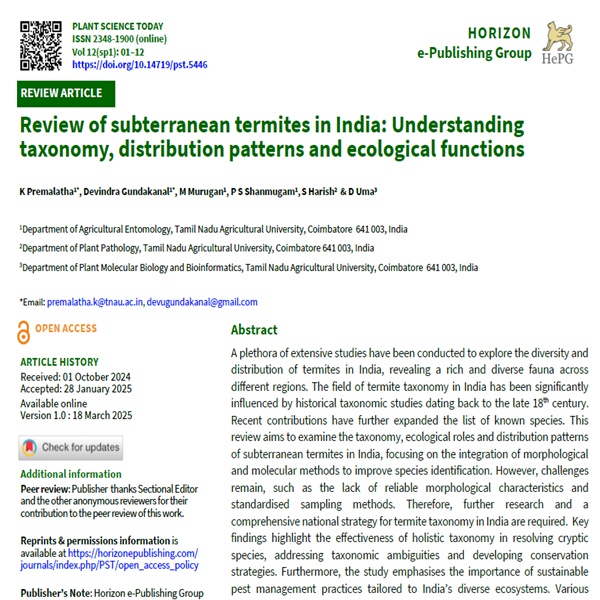 27. Sathyapritha S. Studies on predominant subterranean termite species in garden land ecosystem and its management by food bait-based approach. [Unpublished MSc Thesis]. Tamil Nadu Agricultural University, Coimbatore; 2022.