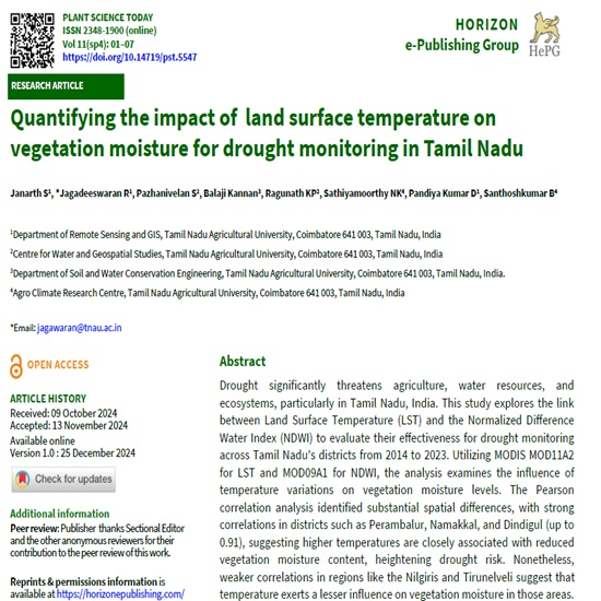 1. Janarth S, Jagadeeswaran R, Pazhanivelan S, Kannan B, Ragunath KP, Sathiyamoorthy NK. Drought monitoring over the Indian state of Tamil Nadu using multitudinous standardized precipitation evapotranspiration index. Plant Sci Today. 2024;11(4):106-115. https://doi.org/10.14719/pst.4653