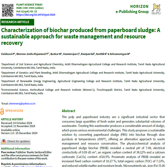 The pulp and paperboard industry are a significant industrial sector that consumes large quantities of fresh water and generates substantial volumes of wastewater. Treating this wastewater produces a considerable amount of sludge, which poses serious environmental challenges. This study proposes a sustainable solution by converting paperboard sludge (PBS) into biochar through slow pyrolysis at temperatures ≤500°C, offering an alternative approach to waste management and resource conservation. The physicochemical analysis of paperboard sludge biochar (PBSB) revealed a neutral pH of 7.49, EC (electrical conductivity) of 0.09 dS m-1, an OC (organic carbon) content of 38.12% and a calcium carbonate (CaCO3) content of 24.5%. Proximate analysis of PBSB revealed an increased fixed carbon content of 10.27 %, total organic carbon (TOC) of 7.13% and reduced volatile matter and moisture levels. Micronutrients viz., iron (Fe) (5.06 mg L-1), manganese (Mn) (419.3 mg L-1), copper (Cu) (26.3 mg L-1) and zinc (Zn) (66.1 mg L-1), were also observed in PBSB. Fourier Transform Infrared Spectroscopy (FTIR) analysis identified various carbon-containing functional groups, including C-Cl, C-N, C-C, H-C=O, C-H and -C≡C-H, indicating substantial chemical transformations during pyrolysis. Scanning Electron Microscopy with Energy Dispersive X-ray (SEM-EDX) analysis revealed that PBSB consists of fine particles with a coarse, fluffy, spongy, porous structure, making it ideal for water adsorption. Elemental analysis through x-ray diffraction (XRD) showed high carbon and oxygen content and significant amounts of aluminosilicates, carbonates and nutrients like phosphorus (P) and potassium (K), suggesting PBSB as a potential slow-release fertilizer. This research highlights the potential of biochar derived from paperboard waste as a sustainable solution for effective waste management and resource recovery.