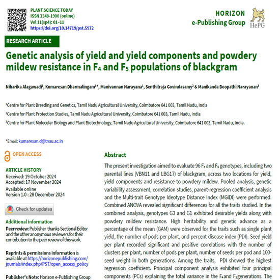- 7. Punithavathy P. Generation mean analysis for powdery mildew resistance in black gram [Vigna mungo (L) Hepper]. Ph.D [Thesis]. Tamil Nadu Agricultural University, Coimbatore; 2023.