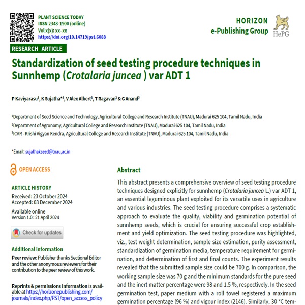 The study presents a comprehensive overview of seed testing procedure techniques designed explicitly for sunnhemp (Crotalaria juncea L.) var ADT 1, an essential leguminous plant exploited for its versatile uses in agriculture and various industries. The seed testing procedure comprises a systematic approach to evaluate the quality, viability and germination potential of sunnhemp seeds, which is crucial for ensuring successful crop establishment and yield optimization. The seed testing procedure was highlighted, viz., test weight determination, sample size estimation, purity assessment, standardization of germination media, temperature requirement for germination, and determination of first and final counts. The experiment results revealed that the submitted sample size could be 700g. In comparison, the working sample size was 70 g and the minimum standards for the pure seed and the inert matter percentage were 98 % and 1.5 % respectively. In the seed germination test, paper medium with a roll towel registered a maximum germination percentage (96 %) and vigour index (2146). Similarly, 30 oC temperature was registered as the maximum germination percentage. Based on this result, the first and final count was fixed as 3rd and 10th days in sunnhemp var ADT 1. Thus, seed testing procedures contribute to advancement in evaluating sunnhemp seed quality, promoting sustainable agriculture and economic prosperity.