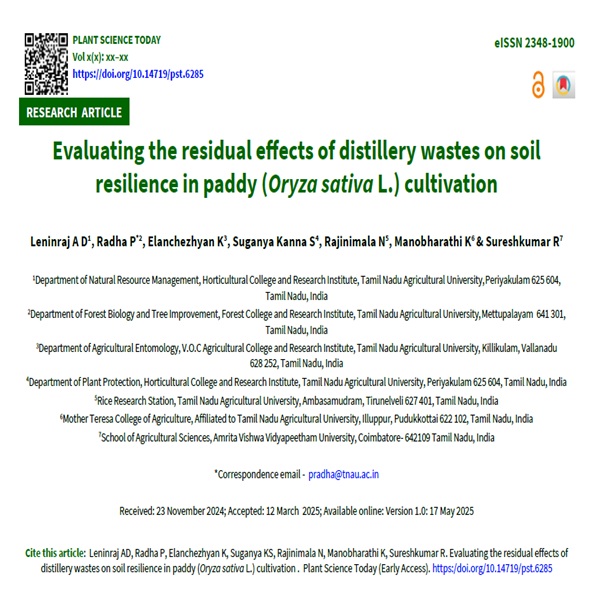 In India, the sugar industry is the second largest agro-based sector, producing significant quantities of by-products such as molasses, press mud etc. Distillery waste, once considered an undesirable by-product of the sugar industry, is now being repurposed to support sustainable agriculture practices. Among these by-products, treated distillery effluent (TDE), a type of wastewater, presents a valuable opportunity for reuse in agricultural. TDE can serve both as a source of irrigation water and as a supplier of essential plant nutrients. The positive impact of organic matter on soil fertility and crop productivity are well documented. Therefore, the application of TDE to soil offers dual benefit: it facilitates the safe disposal of industrial waste while simultaneously enhancing agricultural production. To investigate this potential, a field experiment was conducted to assess the residual effect of TDE and bio-compost on the chemical and biological properties of soil, using paddy (Oryza sativa L. variety BPT-5204) as the test crop. The results indicate that the application of TDE at a rate of 1.5 lakh L ha-¹ (M4), in combination with 100 % nitrogen supplied through bio-compost (S4), significantly improved both the soil chemical and biological properties. Therefore, this combination is recommended as a nutrient source for the residual paddy crop.