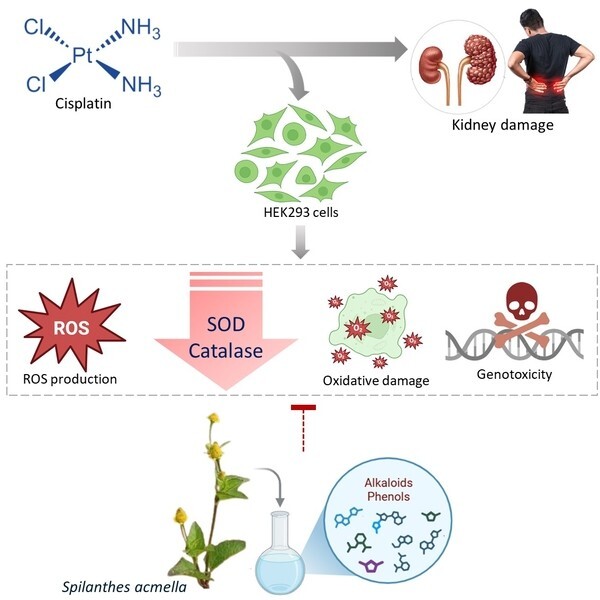 Kidney dysfunction has a devastating effect on health and quality of life, as it is one of the vital organs responsible for maintaining body homeostasis. Chemotherapeutic agents, especially anticancer medications, induce significant toxicity, resulting in renal dysfunction and irreversible kidney damage. This has led to a renewed focus on finding safer, more effective alternatives, such as pharmaceuticals derived from natural sources. The present study investigates the protective effects of ethyl acetate extract of Spilanthes acmella (EASA) against cisplatin-induced nephrotoxicity in human embryonic kidney (HEK293) cells. Preliminary phytochemical screening revealed Alkaloids and phenols as the predominant constituents. A neutral red uptake assay determined the non-toxic concentration of S. acmella and the combinatorial treatment with EASA restored cell viability to 72 %, compared to 47 % in cisplatin treated cells. The antioxidant enzymes SOD and catalase were shown to be diminished by cisplatin, indicating oxidative damage, accompanied by an increase in lipid peroxidation products. EASA significantly elevated enzyme levels and reduced membrane peroxides. Reactive oxygen species production was shown to be reduced in groups co-treated with EASA, as assessed by DCFDA fluorimetry studies. The comet assay also showed a reduction in cisplatin-induced DNA damage following EASA co-treatment. These findings demonstrate that EASA may mitigate the oxidative stress generated by cisplatin, thereby preventing oxidative renal injury.