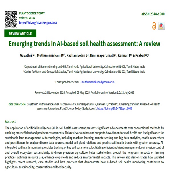 The application of artificial intelligence (AI) in soil health assessment presents significant advancements over conventional methods by enabling more efficient and precise measurements. This review examines and supports how AI monitors soil health and its significance for sustainable land management. AI technologies, including machine learning, remote sensing and big data analytics, enable researchers and practitioners to analyse diverse data sources, model soil-plant relations and predict soil health trends with greater accuracy. AI-integrated soil health monitoring enables tracking of key soil parameters, facilitating efficient nutrient management, soil erosion control and overall ecosystem sustainability. AI-driven precision agriculture helps stakeholders predict the long-term impacts of farming practices, optimize resource use, enhance crop yields and reduce environmental impacts. This review also demonstrates how updated highlights recent research, case studies and best practices that demonstrate how AI-based soil health monitoring contributes to agricultural sustainability, conservation and food security.