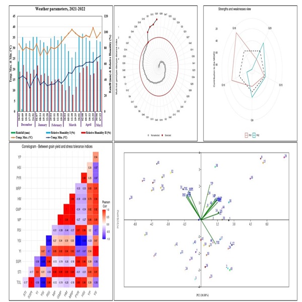 High temperatures during the grain-filling period are a significant constraint in wheat production. Effective selection criteria help plant breeders utilize genetic variation more efficiently, improving stress tolerance in wheat. This study intends to investigate bread wheat genotypes' heat stress tolerance indices to identify and select heat stress-tolerant wheat genotypes. This study assessed 48 bread wheat genotypes during the wheat growing seasons 2021 and 2022 under both optimum and heat stress conditions. Twelve different stress indices were calculated, followed by correlation analysis, principal component analysis (PCA), cluster analysis and Multi-Trait Genotype-Ideotype Distance Index (MGIDI) analysis, all performed using the stress indices. Analysis of variance results showed that genotypes differed significantly for each stress index examined in the study. The significant drop in average grain yield across all genotypes under stress compared to optimal conditions indicates a considerable effect of heat stress on grain production. The results of the correlation, PCA and MGIDI analyses revealed that mean productivity (MP), geometric mean productivity (GMP), harmonic mean (HM) and mean relative performance (MRP) were key discriminating indices in explaining heat stress tolerance among 48 wheat genotypes. Principal component, cluster analysis and MGIDI results were used to draw the inference that GS/2019-20/6046, GS-2018- 19/1007, HPYT-2019-20/416, SAWYT-2018-19/309 and GS/2019-20/5042 show high yielding indices and are suitable under heat stress environment. Thus, the mentioned genotypes hold promise for cultivation in high-temperature environments or as genetic reservoirs for integrating genetic variants into wheat genotypes, enhancing their resilience to heat stress.