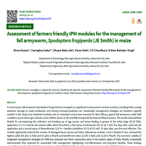 Assessment of farmers friendly IPM modules for the management of fall armyworm, Spodoptera frugiperda (JE Smith) in maize