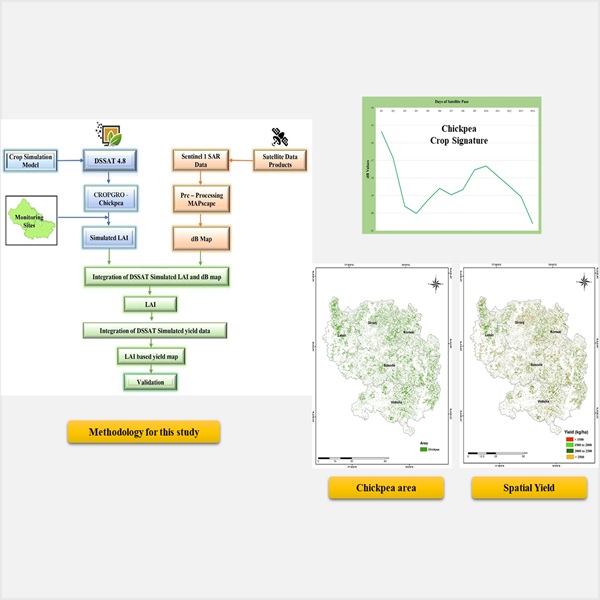 This study estimated chickpea area and yield in Vidisha district, Madhya Pradesh, during Rabi 2022-23 by integrating Sentinel-1A SAR satellite data with the CROPGRO-Chickpea crop simulation model. Sentinel-1A VH-polarized GRD data (20 m spatial resolution) were processed using MAPscape software at 12-day intervals. Temporal backscatter analysis identified distinct growth-stage signatures, enabling accurate crop classification. The total classified chickpea area was 109112 ha. Classification accuracy was 86.8 %, with a Kappa coefficient of 0.74. The DSSAT model simulated chickpea growth and yield, with maximum Leaf Area Index ranging from 1.8 to 4.9 and yields from 1410 to 2449 kg ha-1. Remote sensing-based chickpea yield estimates ranged between 1420 and 2330 kg ha-1. Validation showed strong agreement between observed and simulated values, with accuracies of 89.1 % for LAI and 91.7 % for yield. This study underscores the effectiveness of integrating remote sensing and crop modelling for precise, scalable agricultural monitoring, supporting sustainable crop management and food security.