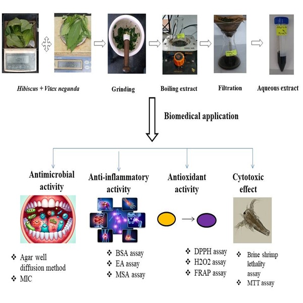 The aim of the present study was to determine the antimicrobial, anti-inflammatory, antioxidant and cytotoxic activities of Hibiscus rosa sinensis and Vitex negundo. Hibiscus rosa-sinensis Linn. (Family Malvaceae) leaves had been used in ethnomedicine to treat a variety of human diseases including aphrodisiac, hypertension, wound healing, diabetes mellitus and cancer. In traditional medicine, the leaves of Hibiscus rosa-sinensis were used to treat dysentery and diarrhoea, to promote the draining of abscesses and as an analgesic. Natural products contained high levels of bioactive compounds that targeted a complex network of proteins involved in a variety of diseases. Vitex negundo (V. negundo), also known as the "chaste tree," was an ethnobotanical significant plant with powerful medicinal properties. In addition to its anti-diabetic properties, V. negundo leaf extract had a beneficial effect on glycoprotein metabolism. Antimicrobial activity was assessed using the agar well diffusion method and MIC assay. Antioxidant activity was evaluated H2O2 assay, FRAP assay and DPPH assay. Anti-inflammatory activity was tested using egg albumin denaturation and membrane stabilisation methods. All activities demonstrated very good results for the herbal formulation. Natural products had a high propensity to target specific proteins while causing fewer side effects and lower toxicity and greater effectiveness. Aqueous extract of V. negundo and Hibiscus rosa sinensis were used as treatment for a variety of diseases and their products have become commercialised, increasing their demand. Overall, the formulation contributed to health protection and showed potential in the management of autoimmune diseases.