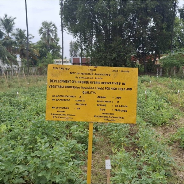 The study was conducted at the Horticultural College and Research Station, Vegetable Science Department of TNAU, Coimbatore. Thirty cowpea genotypes, including 2 check varieties, were used to measure genetic variation, heritability and the genetic improvement across 13 key traits. The results suggested that for all traits, phenotypic variation exceeded genotypic variation, indicating that environmental factors played a dominant role in the observed variation. Genetic diversity was observed from the GCV values for several traits. These traits are associated with high heritability and significant genetic improvement, especially for characters such as pod weight, per plant pod yield and pod length, which are mainly controlled by additive genes; thus, they are suitable for use in breeding program to improve yield. The important trait in selecting high-yield cowpea varieties is shown by the strong positive genetic resemblance between the per pod seed number and per plant pod yield. PCA identified 5 main components that showed 77.53 % of the total variation. Traits with positive values in each component were considered the most important for yield, making them key factors for selecting high-yielding cowpea varieties.