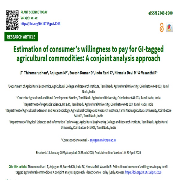Consumer preferences for food products are evolving due to various factors, promoting producers to differentiate their products through unique production methods and adhere to quality standards. Certifications, such as Geographical indications (GI), assist consumers in identifying distinct product attributes while safeguarding producers against unfair competition. Geographical indications products linked to specific regions are recognized for their unique qualities, with certifications like protected designation of origin (PDO) and protected geographical indication (PGI) ensuring quality and market distinction. However, using PGI labels on low-quality products can harm their reputation and diminish their ability to command a premium price. This study explores consumer preferences for GI-certified products, specifically Vripakshi Hill banana, Kodaikanal Hill garlic and Madurai Malli jasmine, in Dindigul and Madurai districts, India. This study surveyed 90 households to identify key attributes influencing consumer preferences. These include production method, quality and price premium for bananas and garlic. For jasmine, the significant factors are price, fragrance, flower size and shelf life. Findings show that GI certifications enhance product quality perception, with variations in attribute importance across commodities. Consumer awareness mainly comes from traditional sources, with consumption patterns differing by product. The study highlights how GI products can support sustainable agriculture, regional growth and market differentiation. It also stresses the importance of educating consumers to raise awareness and improve the competitiveness of these products.