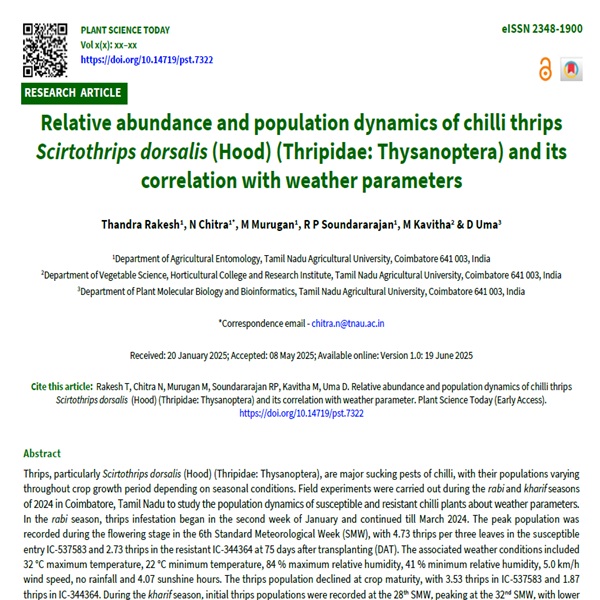 - 28. Mishra SK, Kumar V. Seasonal incidence of Chilli Thrips, Scirtothrips dorsalis (Hood) in relation to weather parameters. Ann Agri Sci. 2023;44(3):3559. https://epubs.icar.org.in/index.php/AAR/article/view/146715.