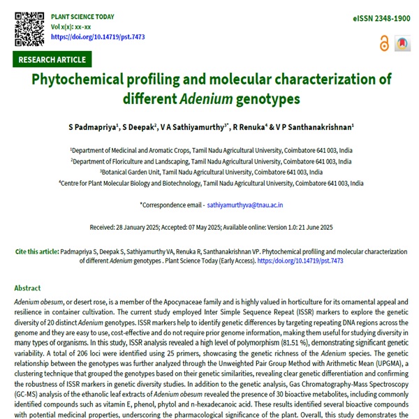 Adenium obesum, or desert rose, is a member of the Apocynaceae family and is highly valued in horticulture for its ornamental appeal and resilience in container cultivation. The current study employed Inter Simple Sequence Repeat (ISSR) markers to explore the genetic diversity of 20 distinct Adenium genotypes. ISSR markers help to identify genetic differences by targeting repeating DNA regions across the genome and they are easy to use, cost-effective and do not require prior genome information, making them useful for studying diversity in many types of organisms. In this study, ISSR analysis revealed a high level of polymorphism (81.51 %), demonstrating significant genetic variability. A total of 206 loci were identified using 25 primers, showcasing the genetic richness of the Adenium species. The genetic relationship between the genotypes was further analyzed through the Unweighted Pair Group Method with Arithmetic Mean (UPGMA), a clustering technique that grouped the genotypes based on their genetic similarities, revealing clear genetic differentiation and confirming the robustness of ISSR markers in genetic diversity studies. In addition to the genetic analysis, Gas Chromatography-Mass Spectroscopy (GC-MS) analysis of the ethanolic leaf extracts of Adenium obesum revealed the presence of 30 bioactive metabolites, including commonly identified compounds such as vitamin E, phenol, phytol and n-hexadecanoic acid. These results identified several bioactive compounds with potential medicinal properties, underscoring the pharmacological significance of the plant. Overall, this study demonstrates the effectiveness of ISSR molecular markers in both genetic evaluation and the identification of bioactive compounds in Adenium species.